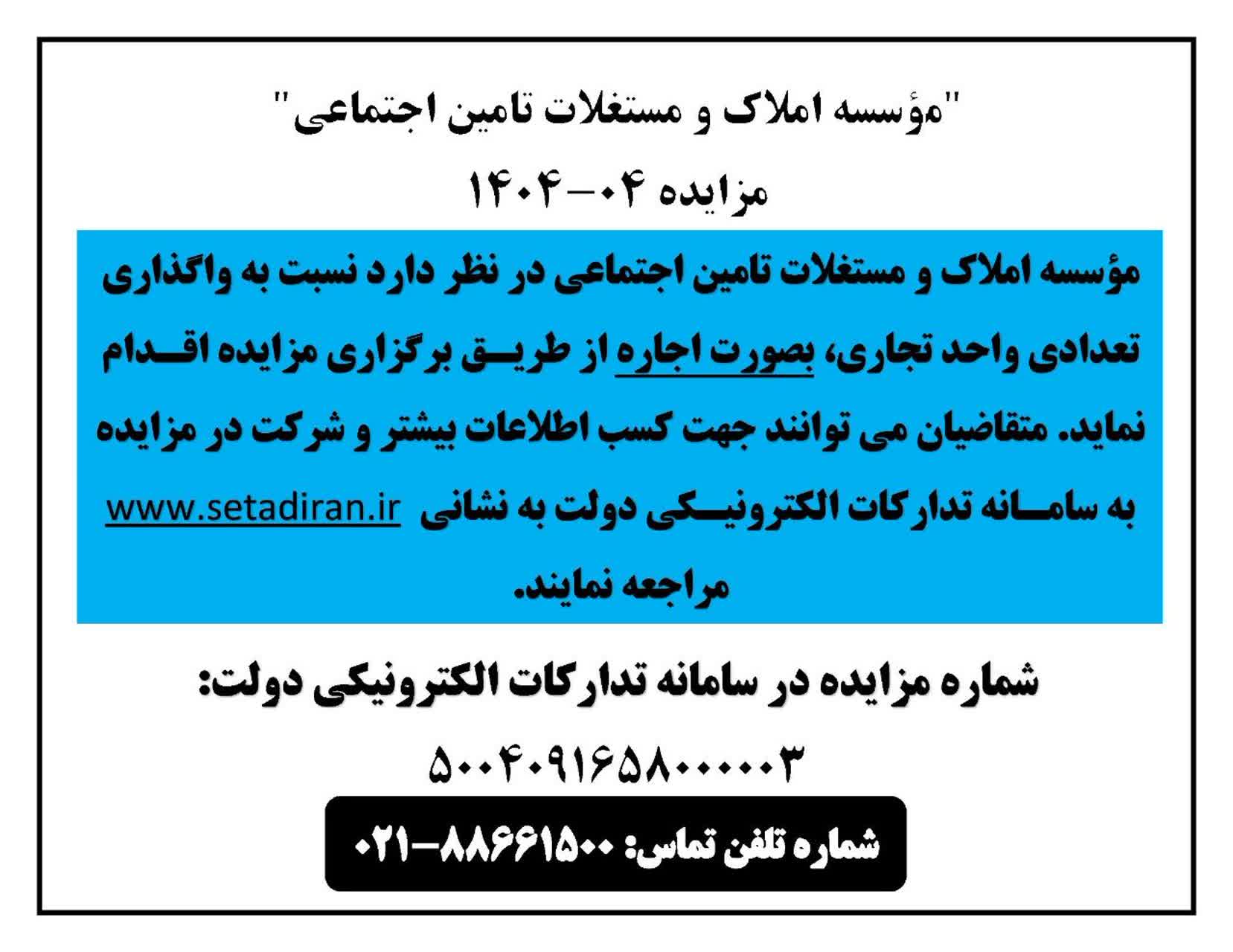 مزایده املاک مؤسسه تأمیناجتماعی از ۴ آبان آغاز شده و شرکت در آن از طریق سامانه تدارکات الکترونیک دولت امکانپذیر است .پیشنهادها تا ۲۰ آبان دریافت و نتیجه در ۲۸ آبان اعلام میشود.