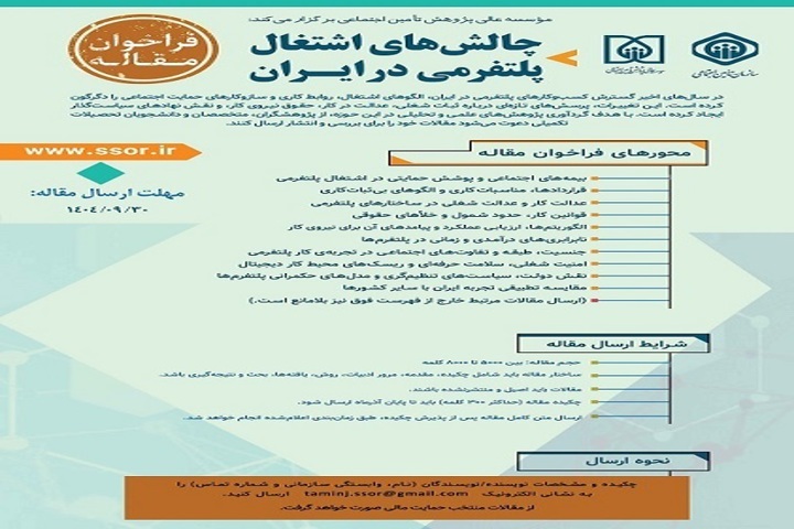 به گزارش تأمین 24 به نقل روابط عمومی موسسه عالی پژوهش تامین اجتماعی، در این فراخوان آمده است: در سالهای اخیر گسترش کسبوکارهای پلتفرمی در ایران، الگوهای اشتغال، روابط کاری و سازوکارهای حمایت اجتماعی را دگرگون کرده است. این تغییرات، پرسشهای تازهای درباره ثبات شغلی، عدالت در کار، حقوق نیروی کار، و نقش نهادهای سیاستگذار ایجاد کرده است.