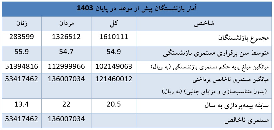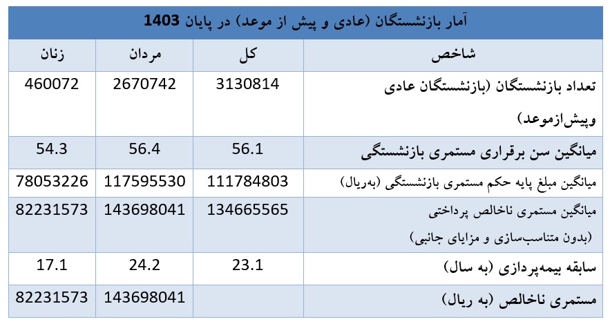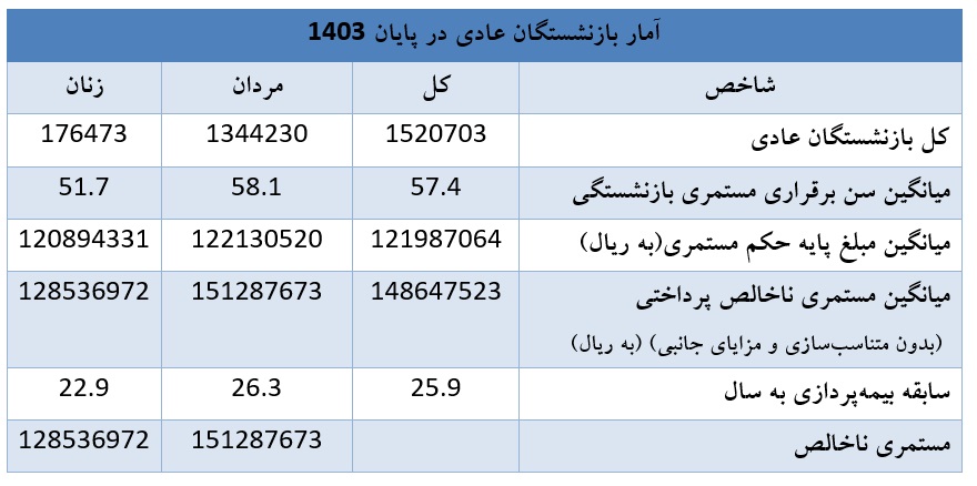 همچنین طی سال 1403 متوسط سن برقراری مستمری بازنشستگی 55.4 سال اعلام شده است که به تفکیک نشان میدهد؛ مردان در سن 55.6 سالگی و زنان در 53.9 سالگی بازنشسته شدهاند. آمار مذکور موید این مسئله است که زنان بهطور متوسط 1.7 سال زودتر از مردان بازنشسته شدهاند.