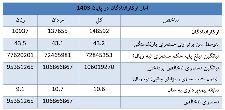 آمارها نشان میدهد که طی سال 1403 تعداد 148 هزار و 592 نفر به دلیل ازکارافتادگی مشمول دریافت مستمری شدهاند. براین اساس میانگین سن برقراری مستمری بازنشستگی 43.2 درصد اعلام شده است که به تفکیک مردان با 43.1 درصد سن و زنان با 43.5 درصد سن ازکارافتاده شدهاند.
