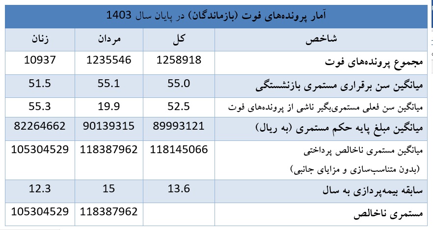 طی سال 1403 تعداد یک میلیون 258 هزار و 918 پرونده فوت (بازماندگان) در سازمان تأمیناجتماعی تشکیل شده است که از این میان یک میلیون و 235 هزار و 546 مورد پرونده مربوط به مردان و 10 هزار و 939 پرونده مربوط به زنان بوده است.