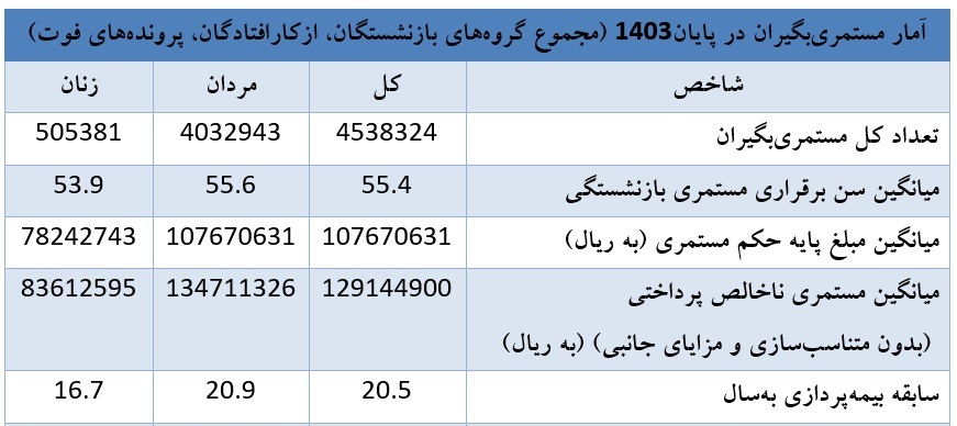 سازمان تأمیناجتماعی تعداد کل مستمریبگیران این سازمان در پایان سال 1403 را 4 میلیون و 538 هزار و 324 نفر اعلام کرد.