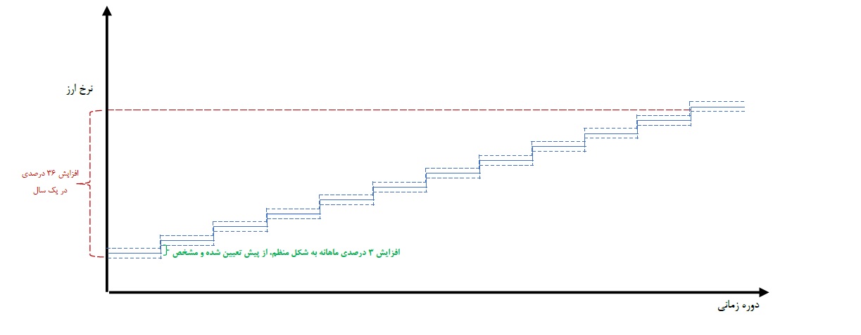 به عنوان مثال شکل بالا یک کاهش ارزش پول ملی (افزایش نرخ ارز) به صورت جهش 36 درصدی را در مقایسه با یک نظا م ارزی میخکوب خزنده با کاهش ارزش پولی ملی (افزایش نرخ ارز) 3 درصد ماهانه نشان می دهد.