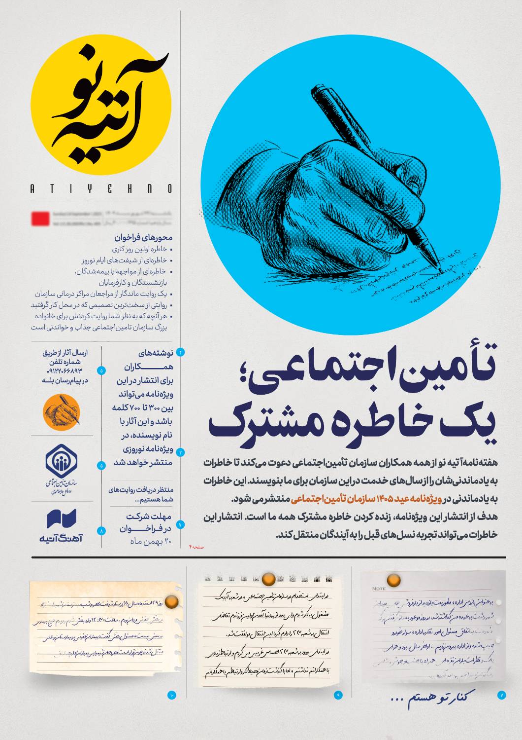 _و هر آنچه که به نظر شما روایت کردنش برای خانواده بزرگ تامین اجتماعی جذاب و خواندنی است آثار ارسالی برای فراخوان باید بین 300 تا 700 کلمه باشد و این آثار به نام نویسنده، در ویژهنامه نوروز 1405 هفته نامه آتیه نو منتشر خواهد شد. مهلت ارسال آثار تا 20 بهمن ماه است و علاقهمندان میتوانند از طریق شماره تلفن 09122066893 در پیامرسان بله، مطالب خود را ارسال نمایند.